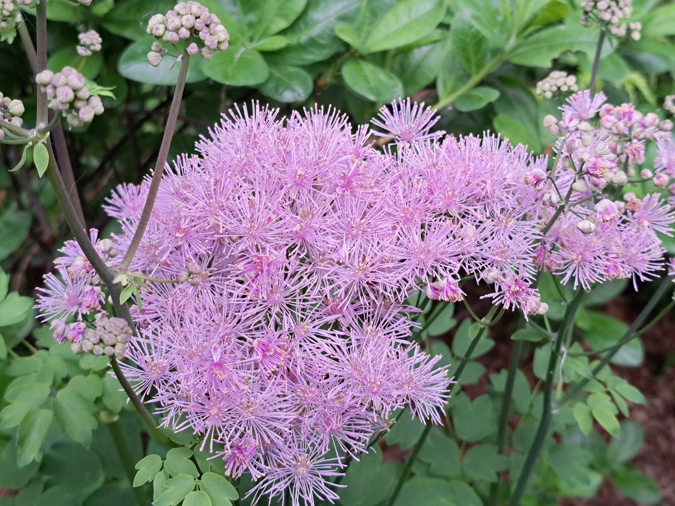 Fluffy lilac pink flowers on dark stems with ferny foliage in late summer. Sun or partial shade. Moisture retentive soil. Height 75cm.
