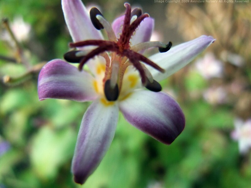 Summer flowering Toad Lily with lavender flowers and a yellow centre. Ideal for a woodland border. Height 60cm.